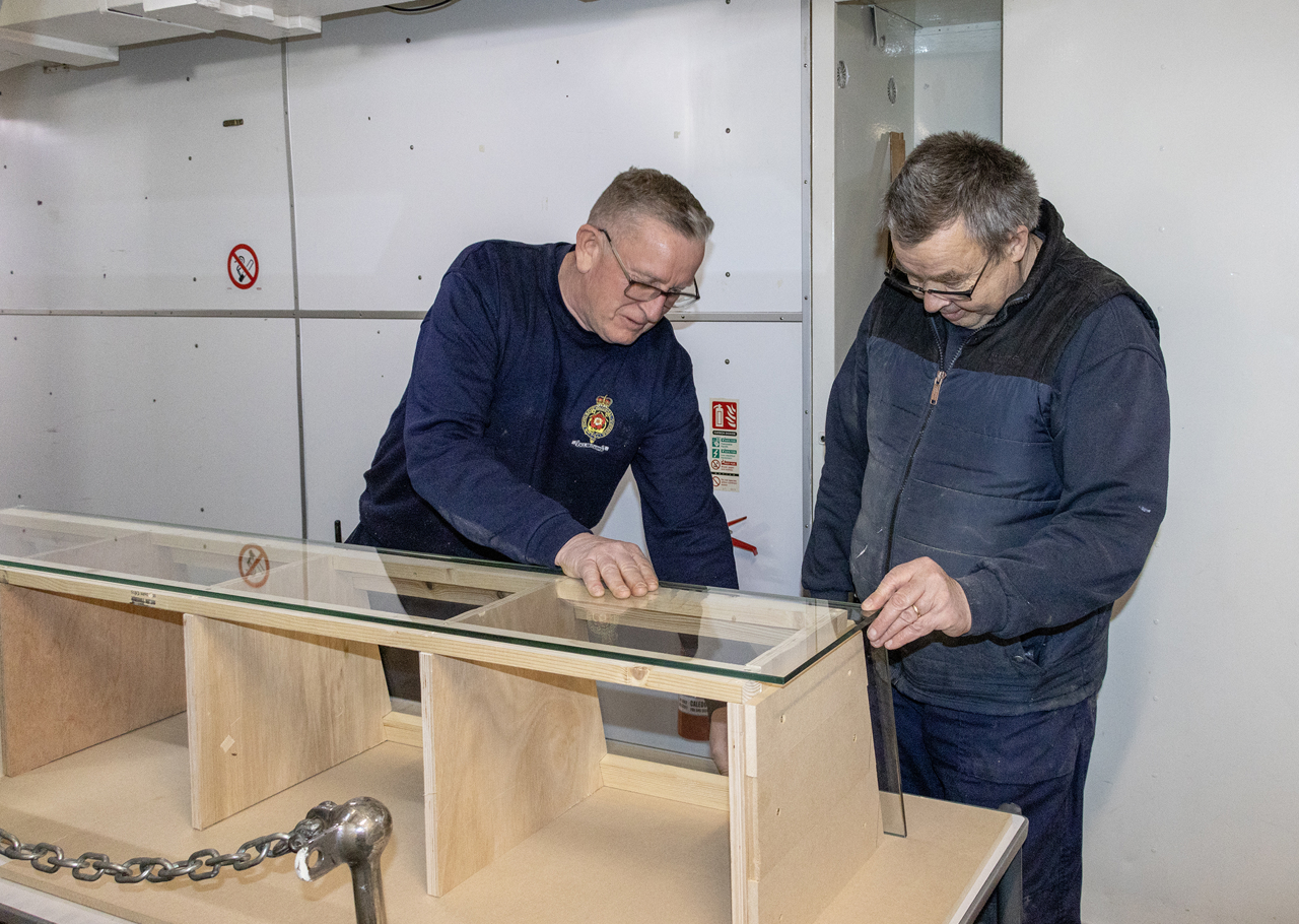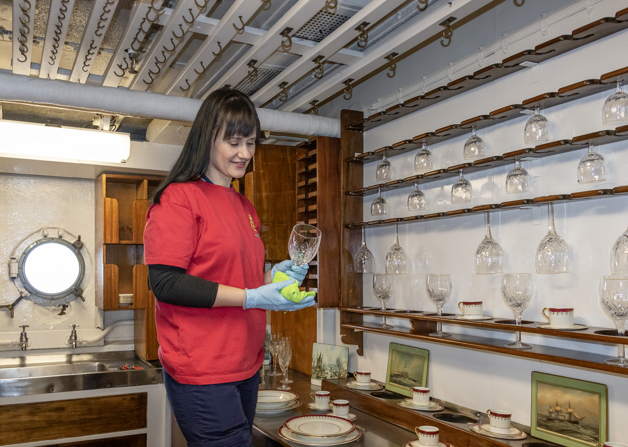 Every glass, cup and saucer has its own specially designed hook or compartment to hold it in place, in the China and Glass Pantry. Housekeeper Angelina, ensuring that the glasses are polished to perfection.