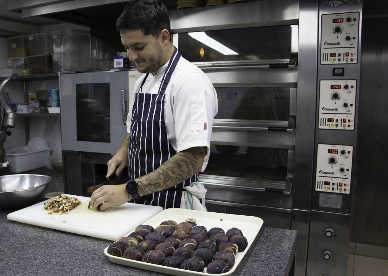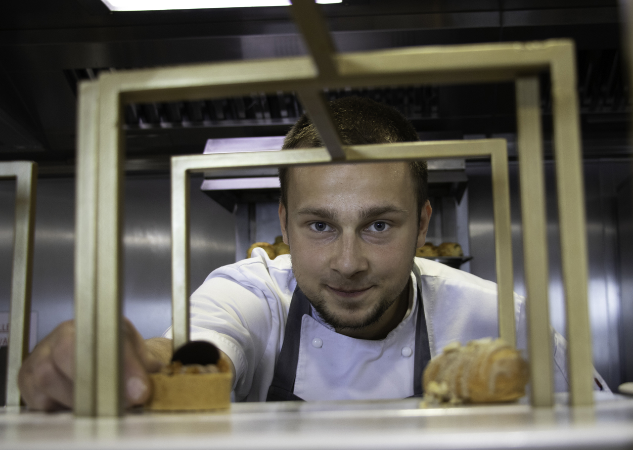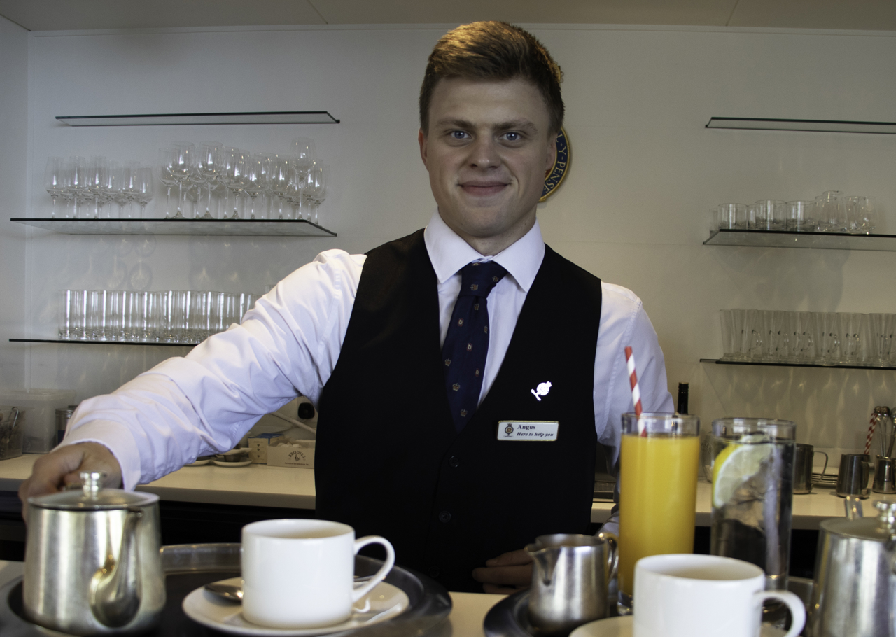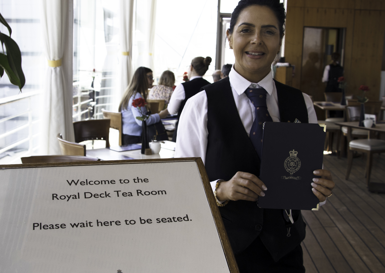Wendy, Waiter, greets guests at the entrance to the Royal Deck Tea Room. The light-filled dining space was originally used by the Royal Family for playing games and entertainment.