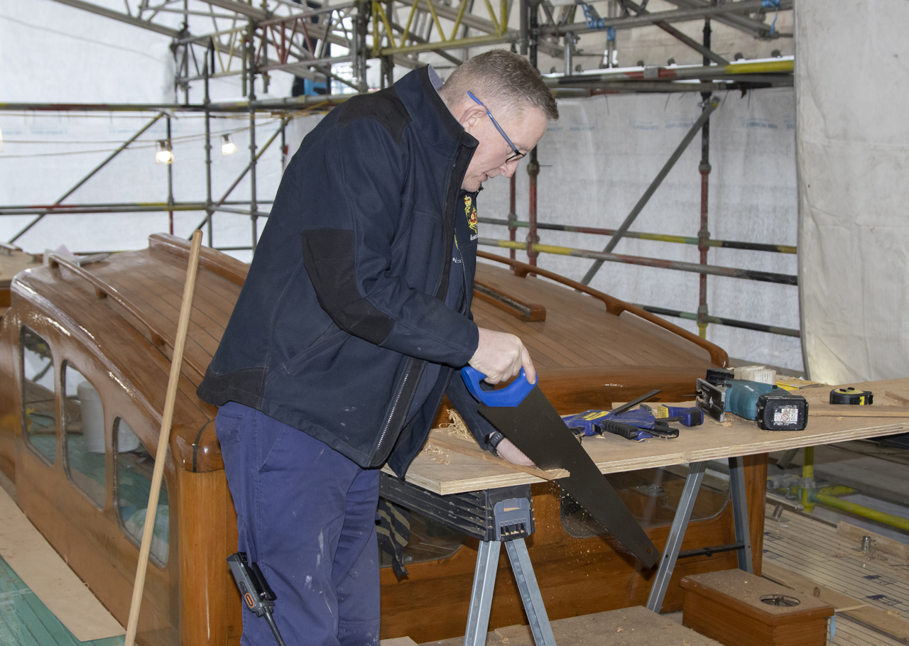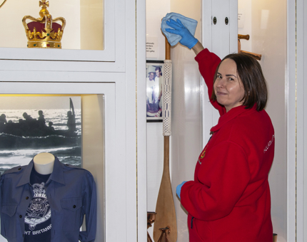 Renata, Housekeeper, polishing the oar in the Visitor Centre, which was used to stir the Christmas pudding mixture in the Galley by members of the Royal Family and Yotties.