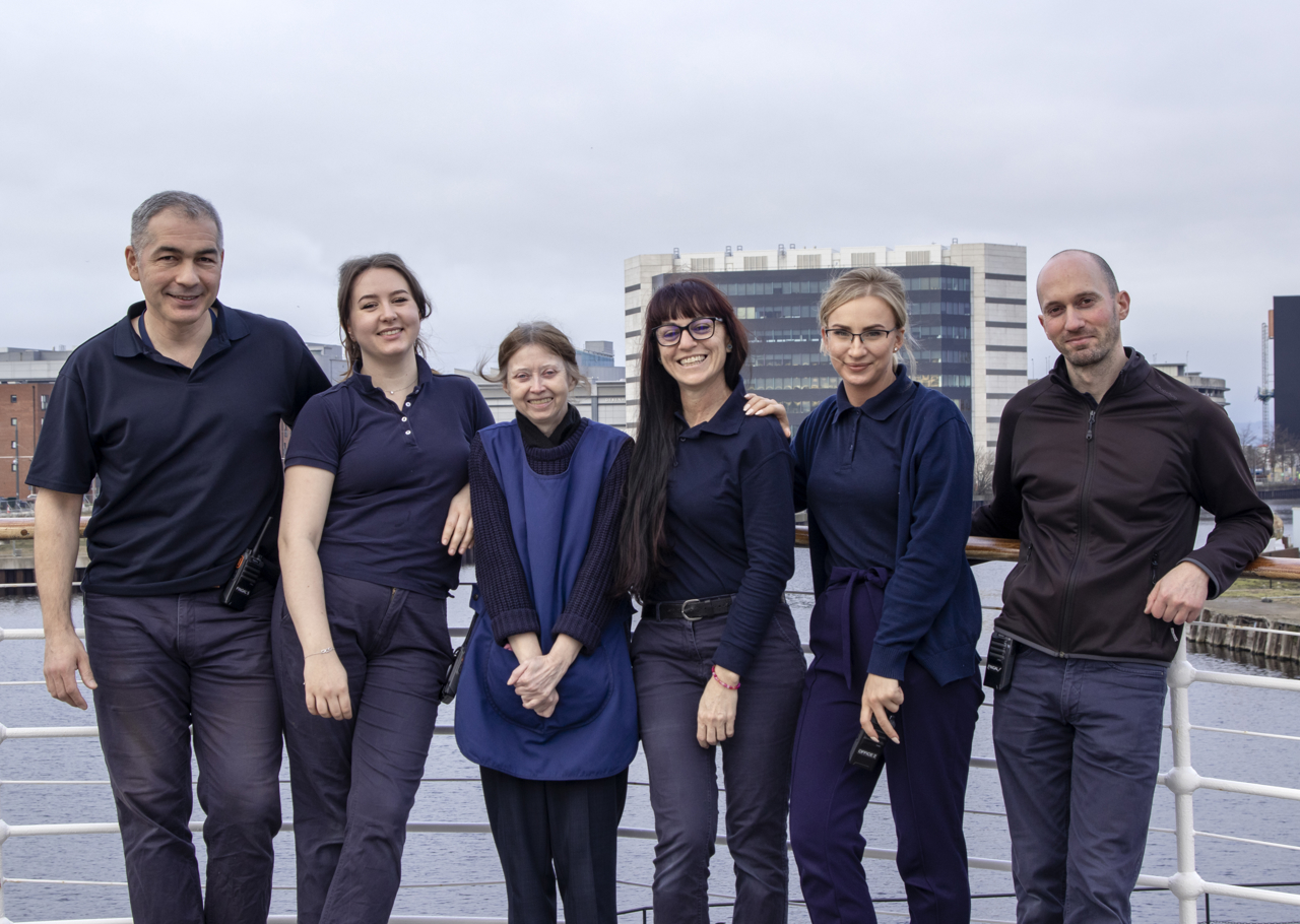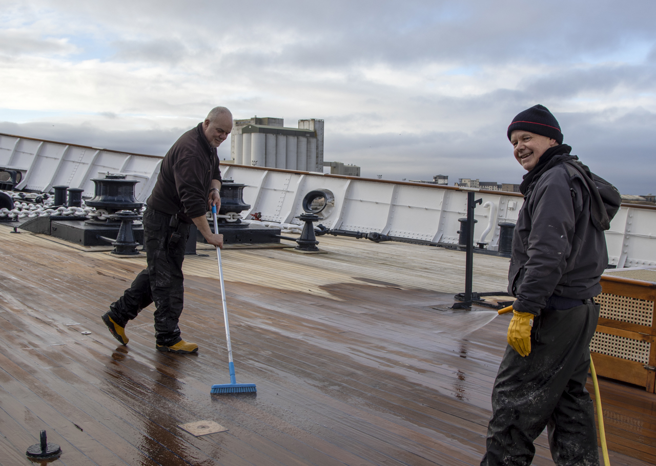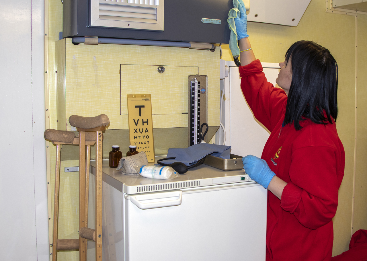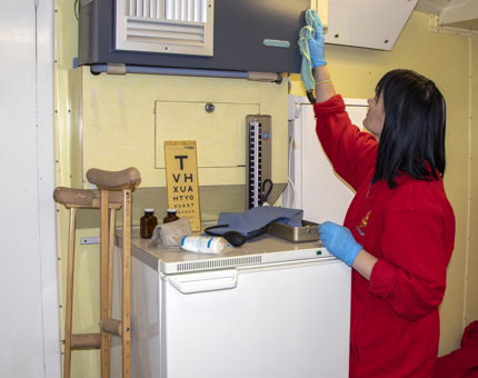 Housekeeper, Anhelina, carrying out a deep clean of the Sick Bay, next to Britannia’s own Operating Theatre.