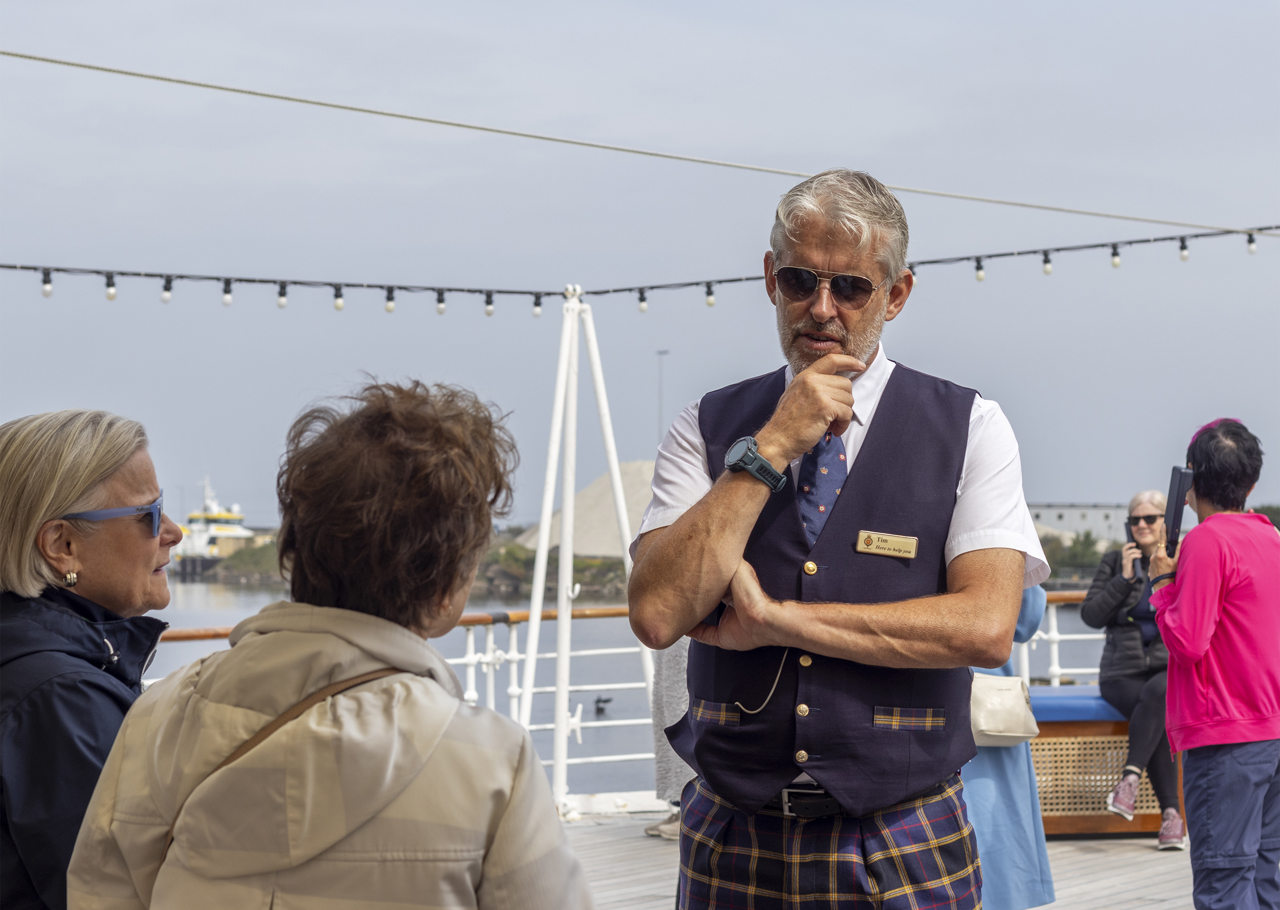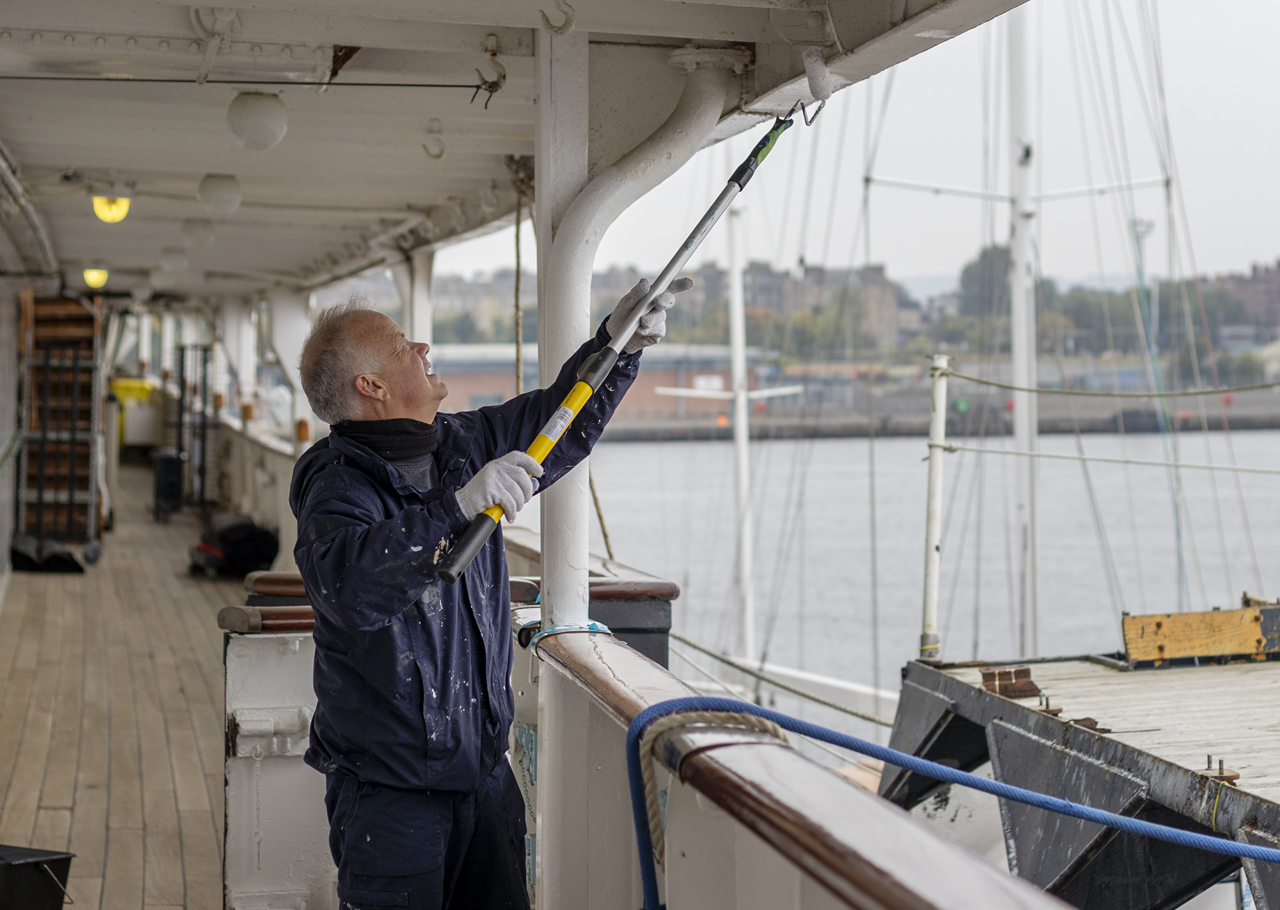 Tim, Visitor Assistant, sharing interesting stories about life for the Royal Family on board Britannia.