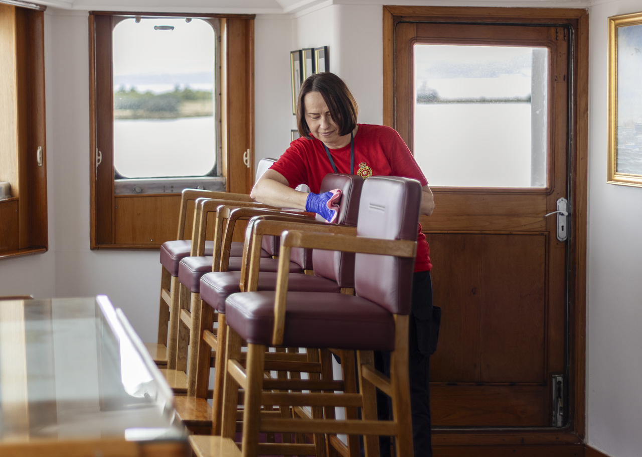Housekeeper, Renata, in the Chart Room. Our Housekeepers are dedicated to keeping all areas of Britannia looking shipshape.