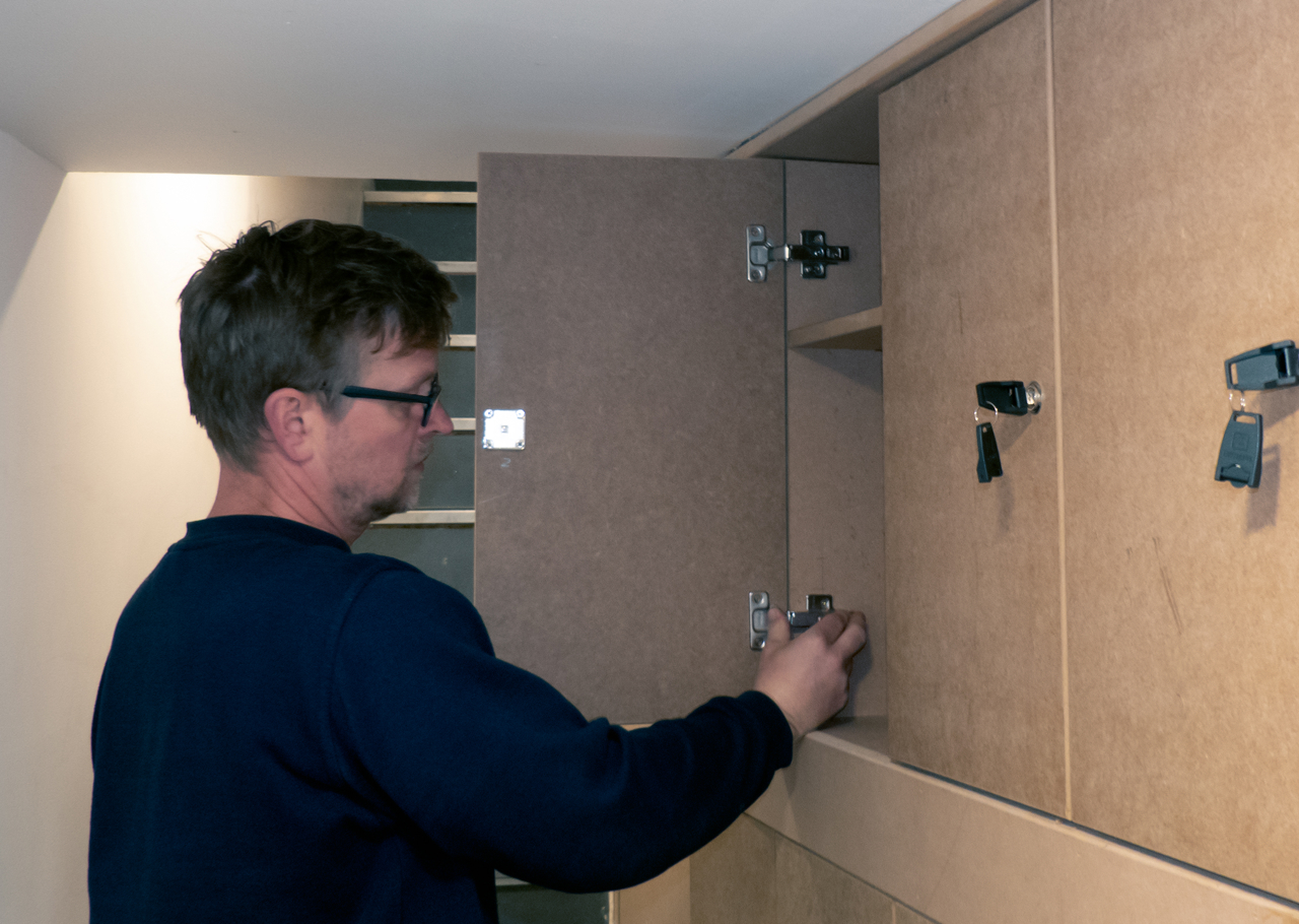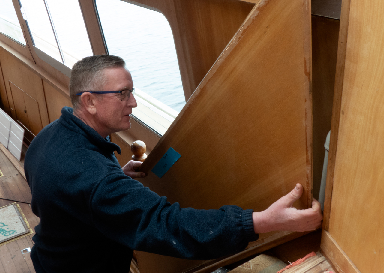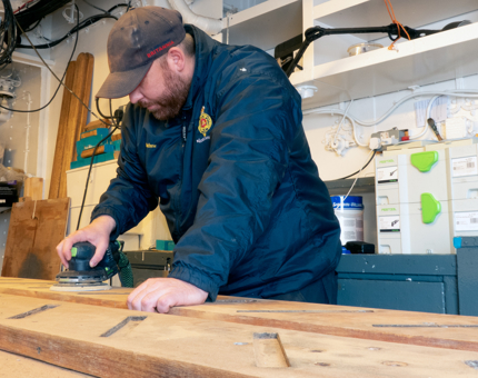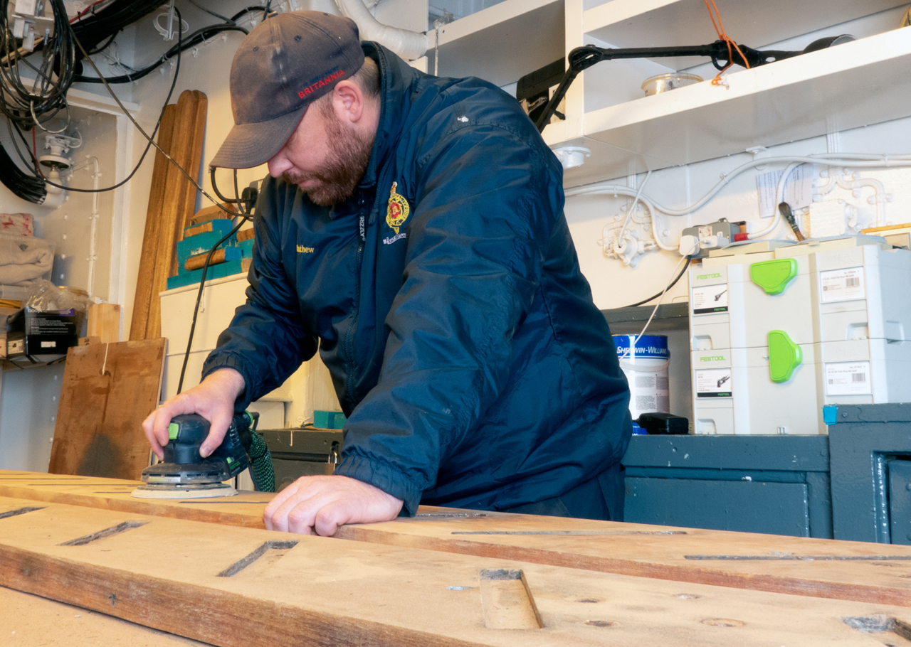 Using the orbital sander on the step supports for the ladder from the Quarter Deck to the Verandah Deck.