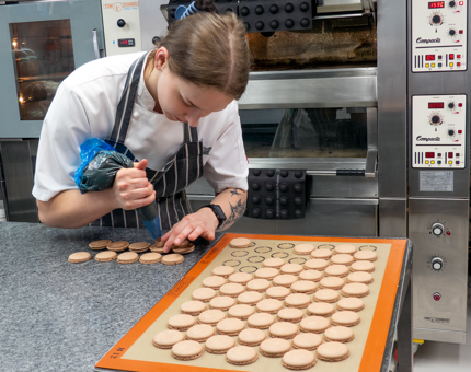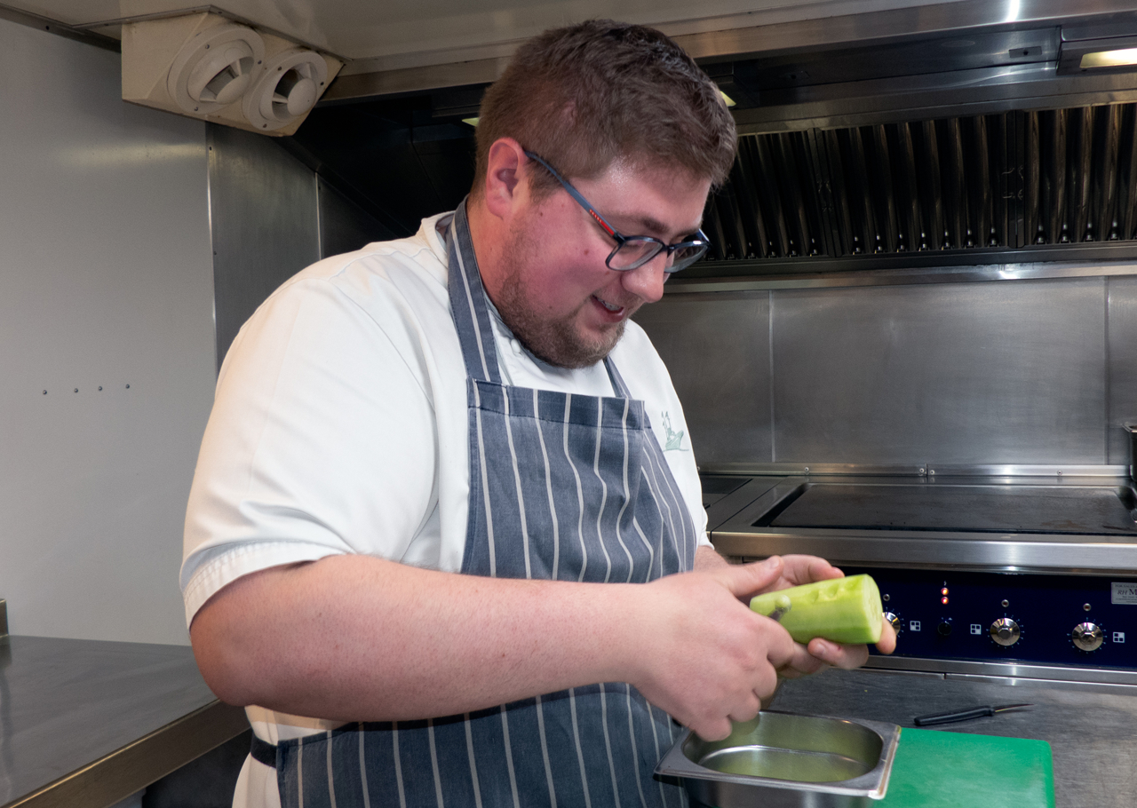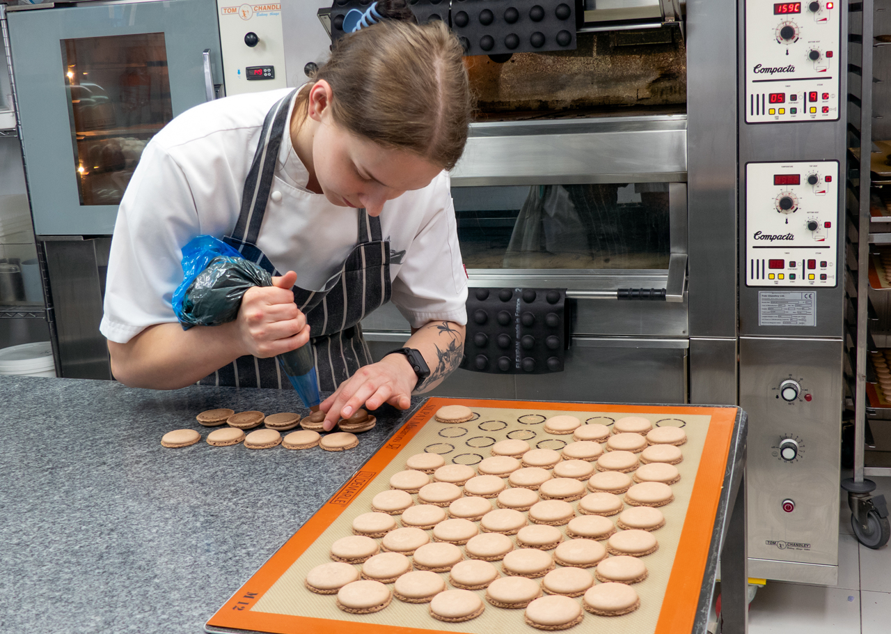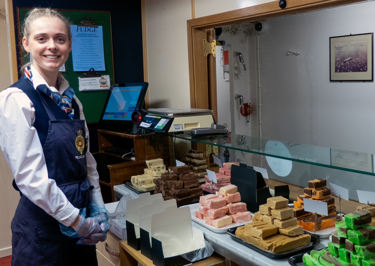In the NAAFI, Francesca, Sales Assistant, standing ready to offer samples of our flavoured fudge to visitors.