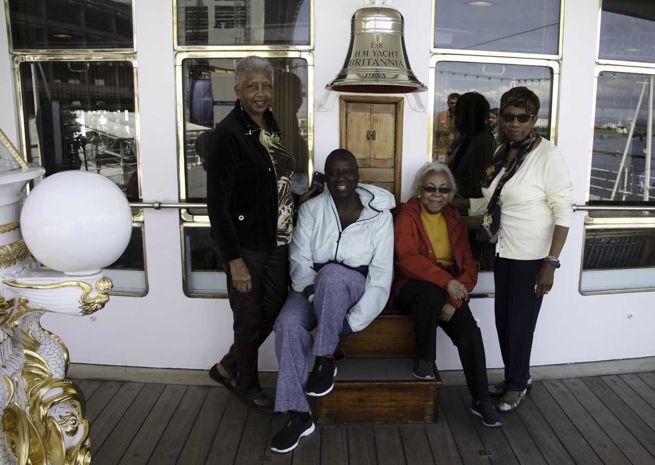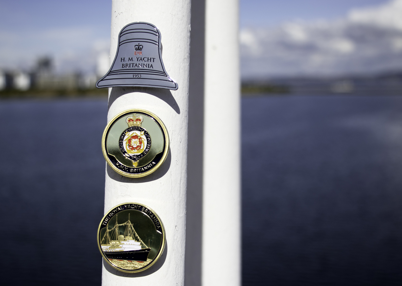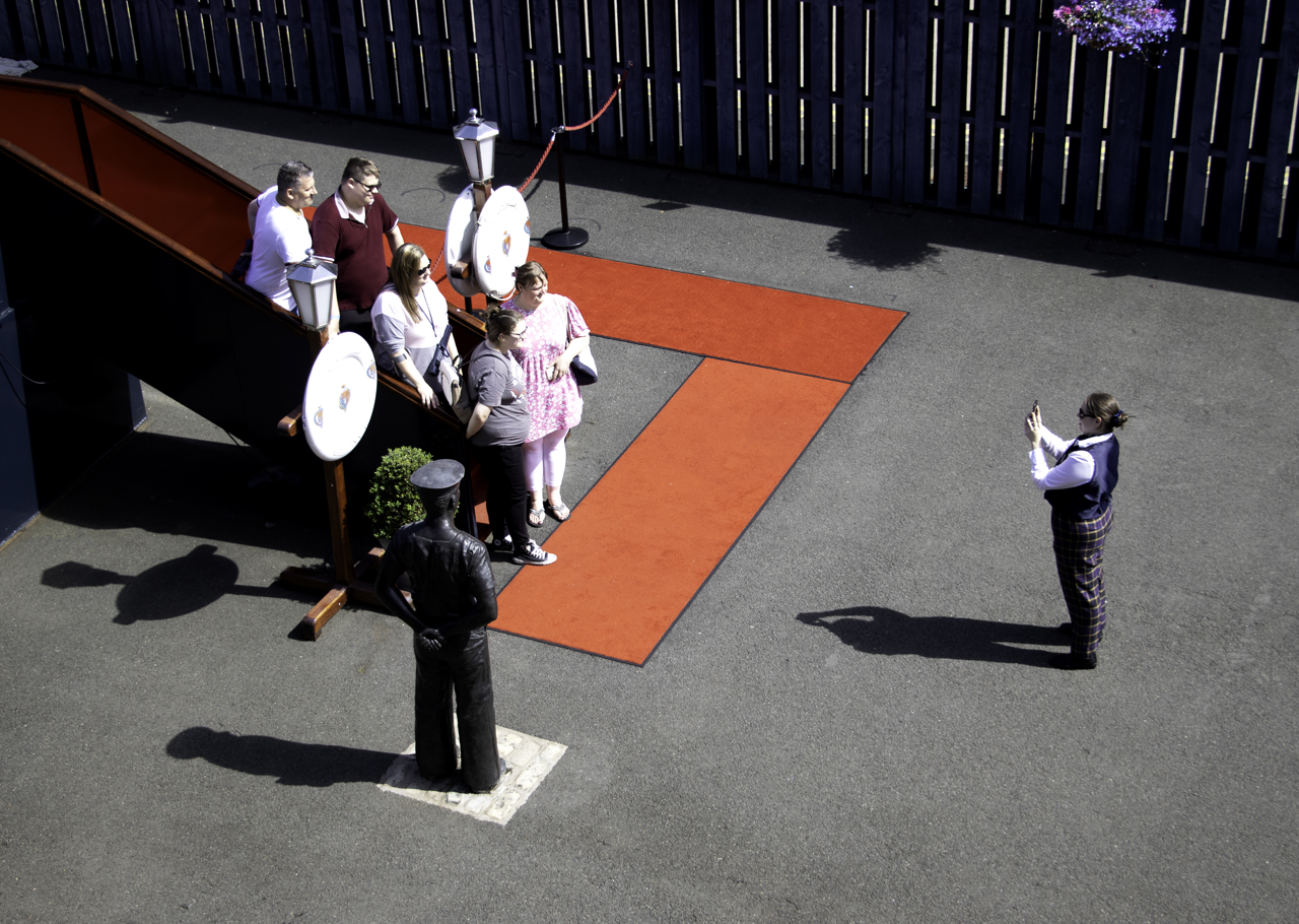 A group of visitors posing for a photograph next to the iconic Britannia Bell.