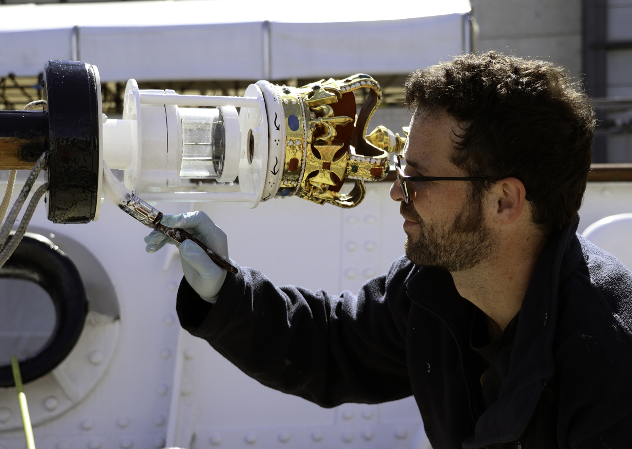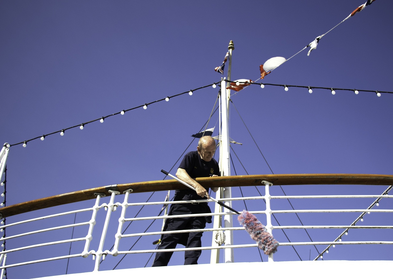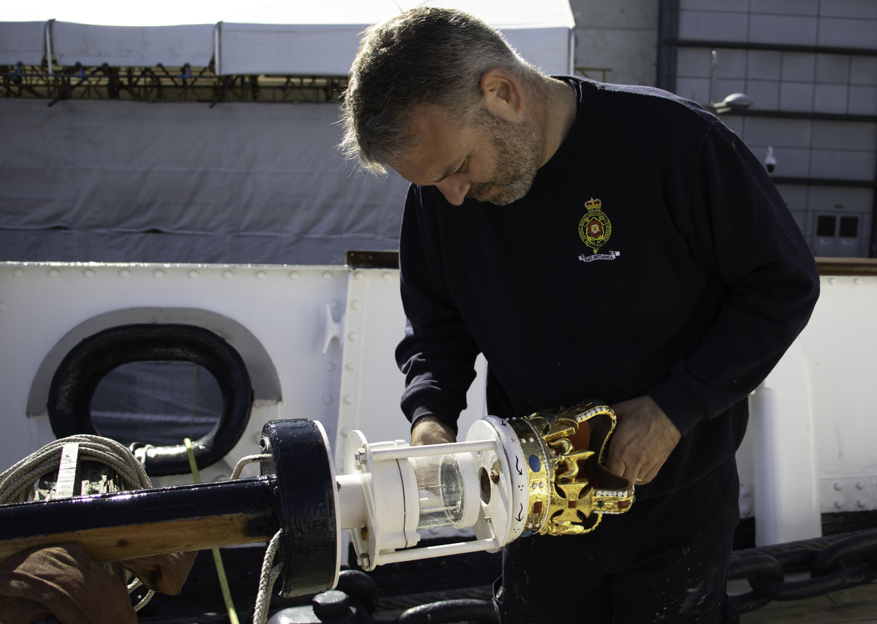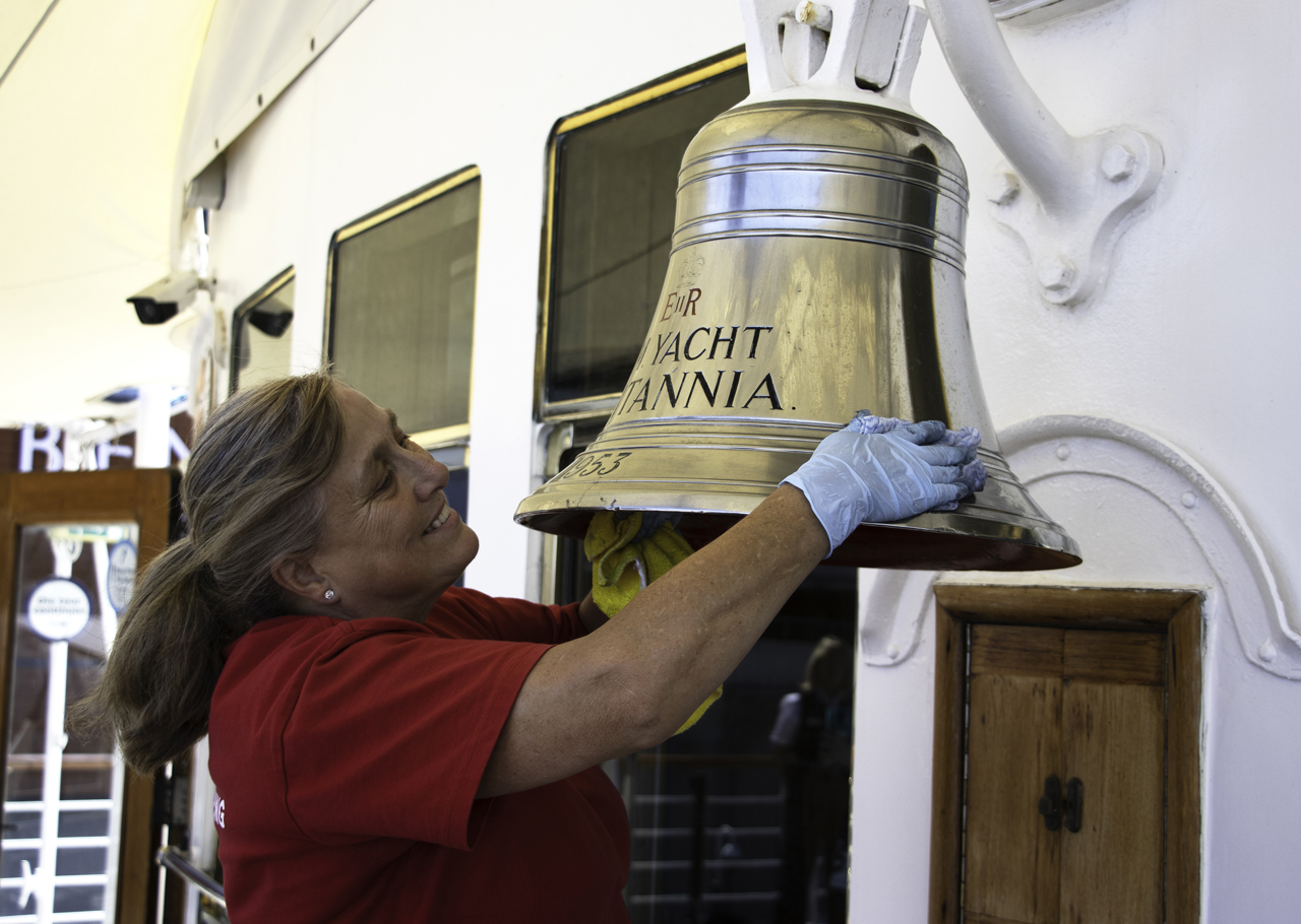 Eileen, Housekeeper, polishing the Britannia Bell.