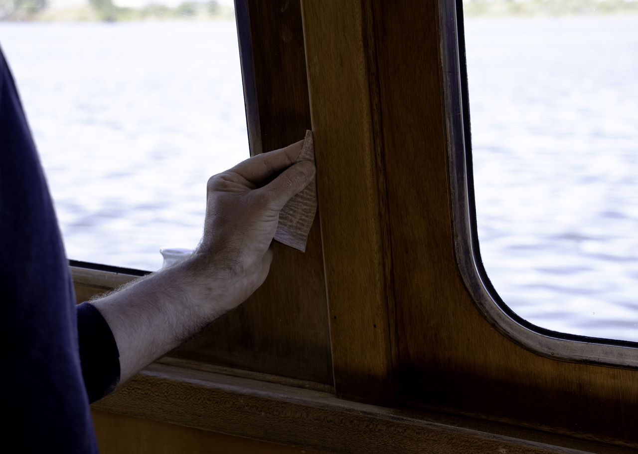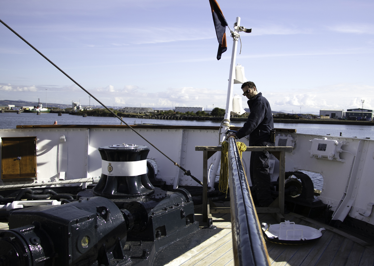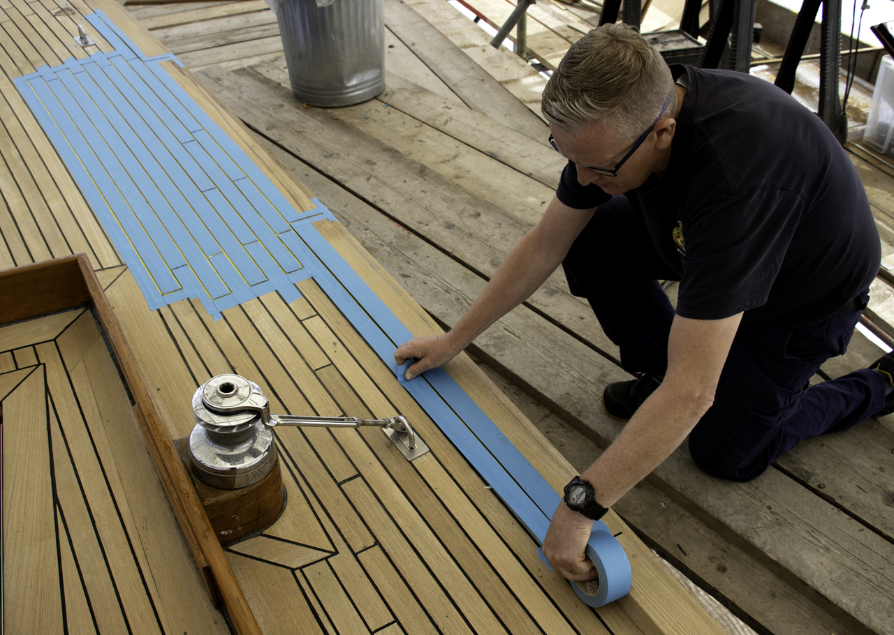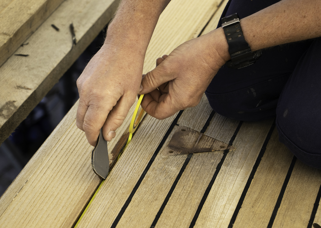 Mark prepping the deck aboard Royal Racing Yacht Bloodhound for caulking.