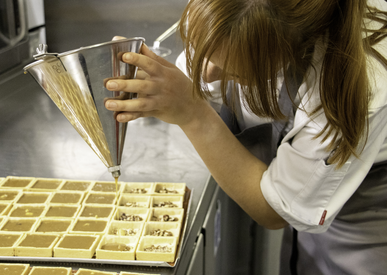 Arleta, Chef de Partie, preparing the Dulche de Leche chocolate and hazelnut tart for Afternoon Tea.