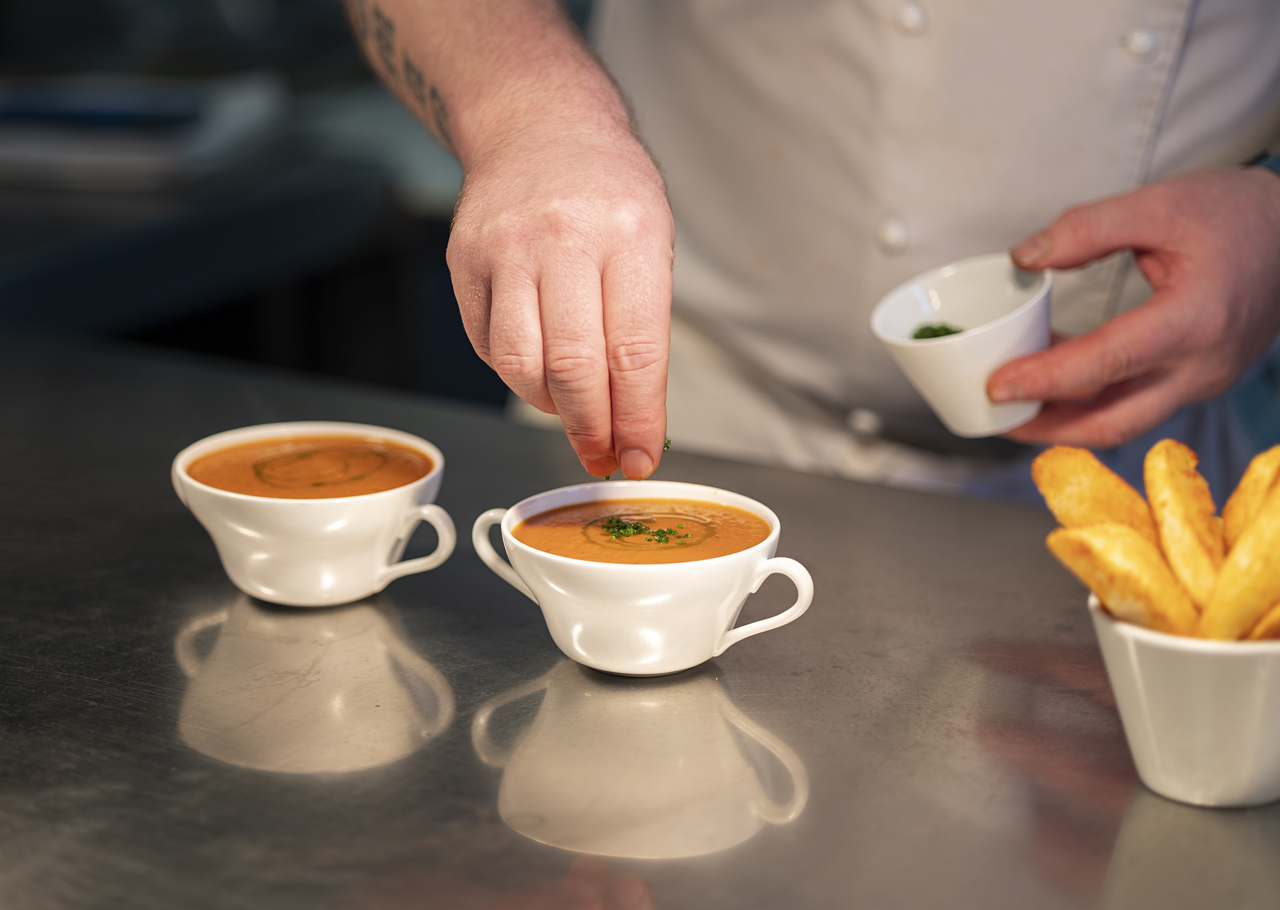 Demi-Chef de Partie, Pawel, preparing bowls of roasted red bell pepper and vine plum tomato soup to be served to the Tearoom's visitors.