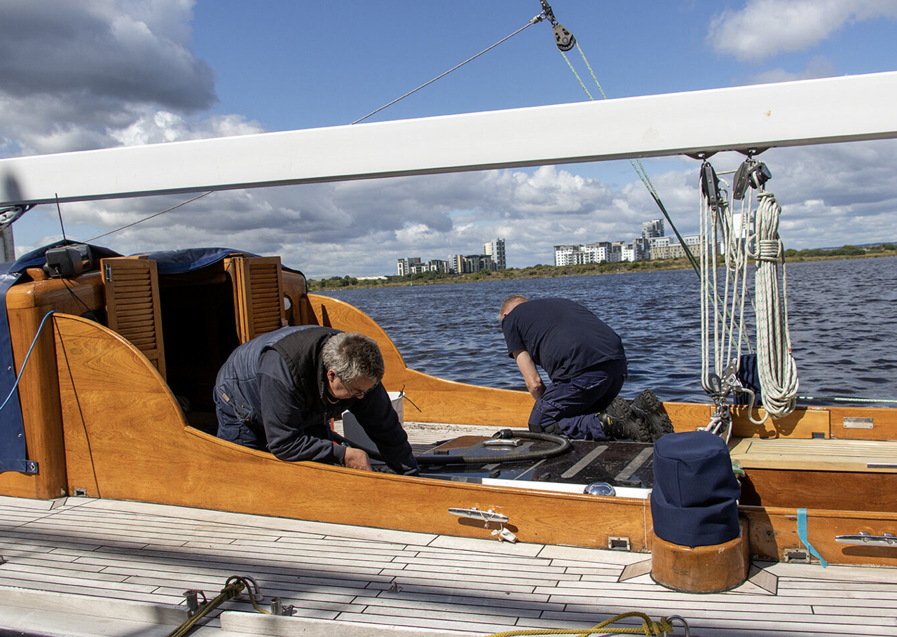 Gary and Mark lifting the old caulking on Royal Racing Yacht Bloodhound, ready to re-caulk the deck.