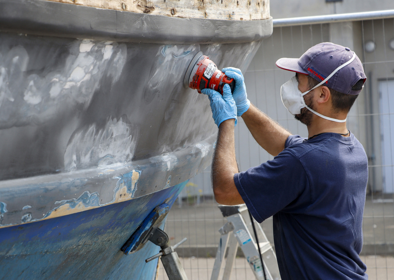 Jos and Rab painting the hull of the ship Britannia blue, the colour was especially chosen by Queen Elizabeth II in preference to the traditional black.