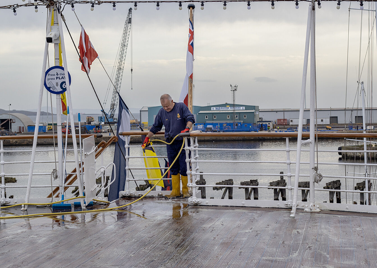 Nigel washing the decks ensuring the same standards are maintained on board as they were during Royal service.