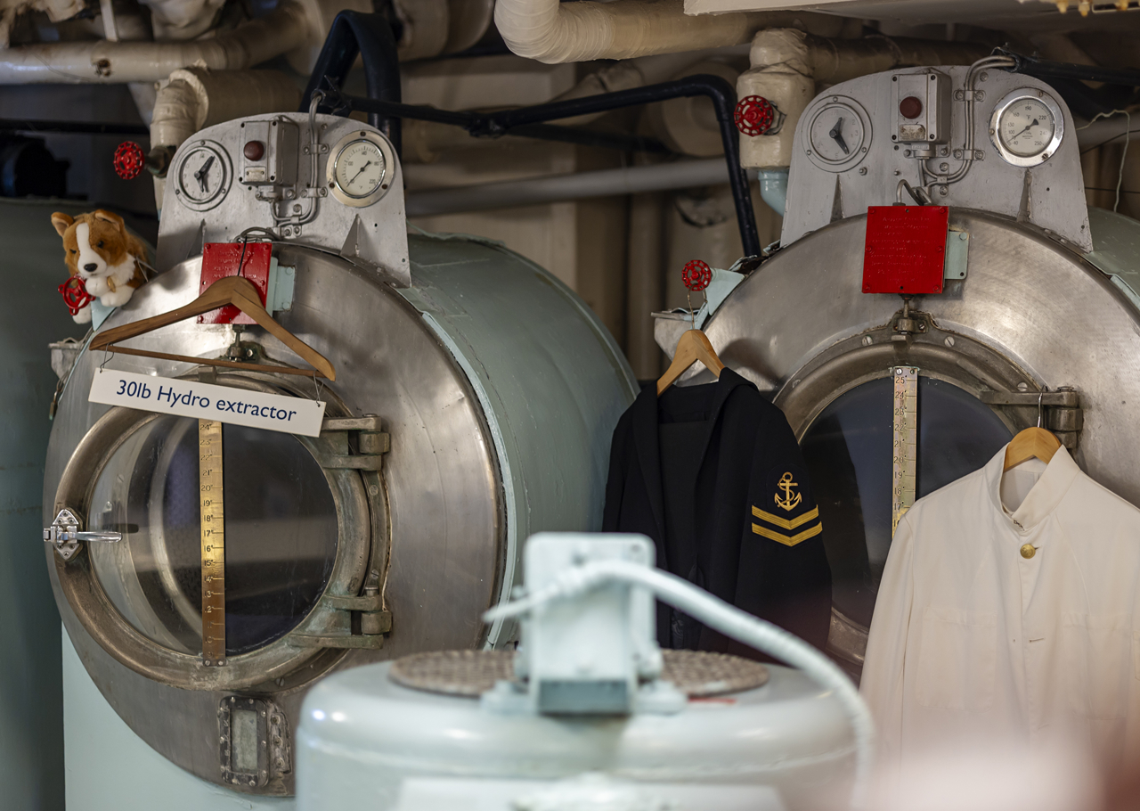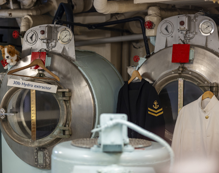 The onboard Laundry was a busy, hot and noisy environment. On a single day, up to 600 shirts could make their way through the washers and dryers.