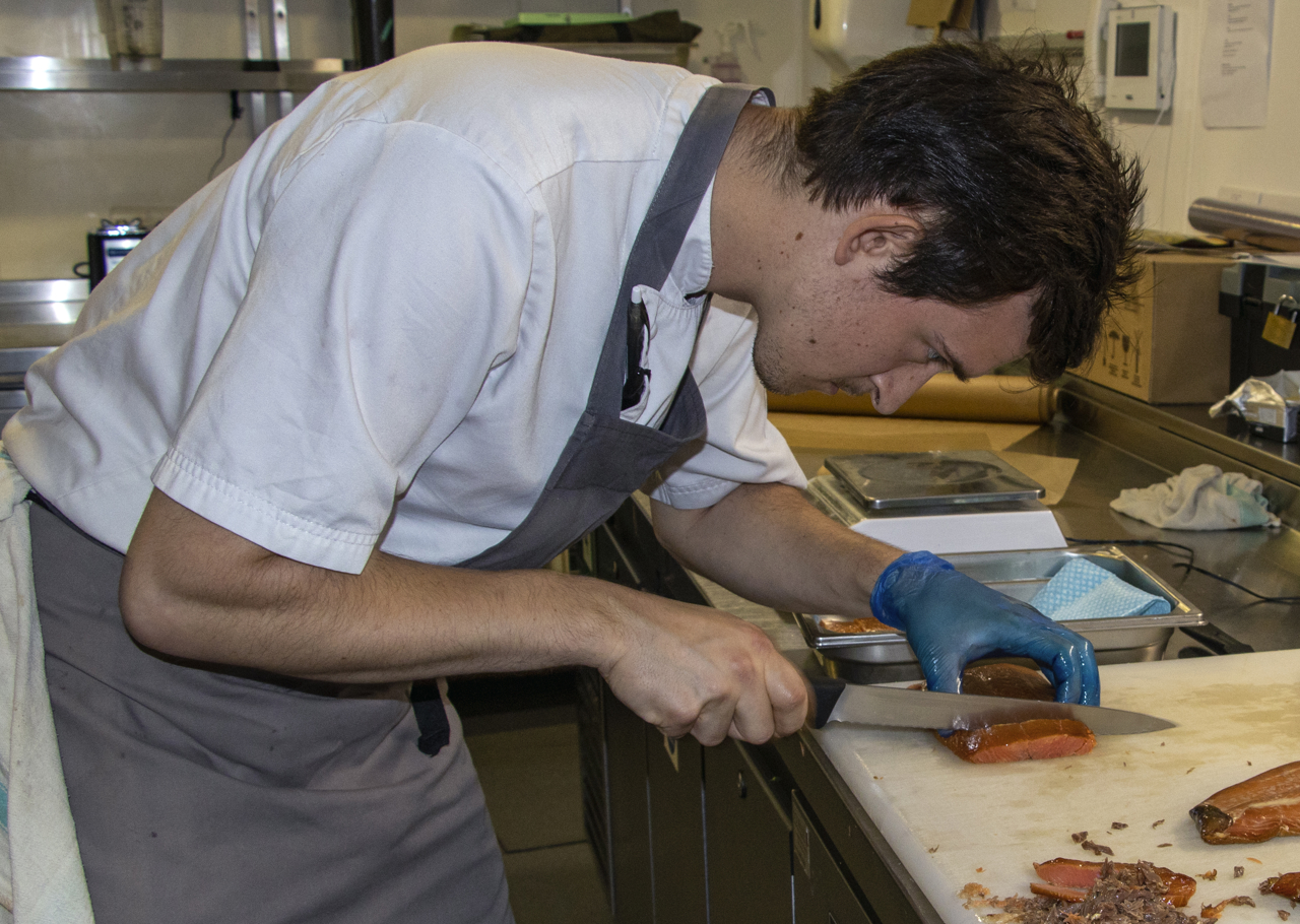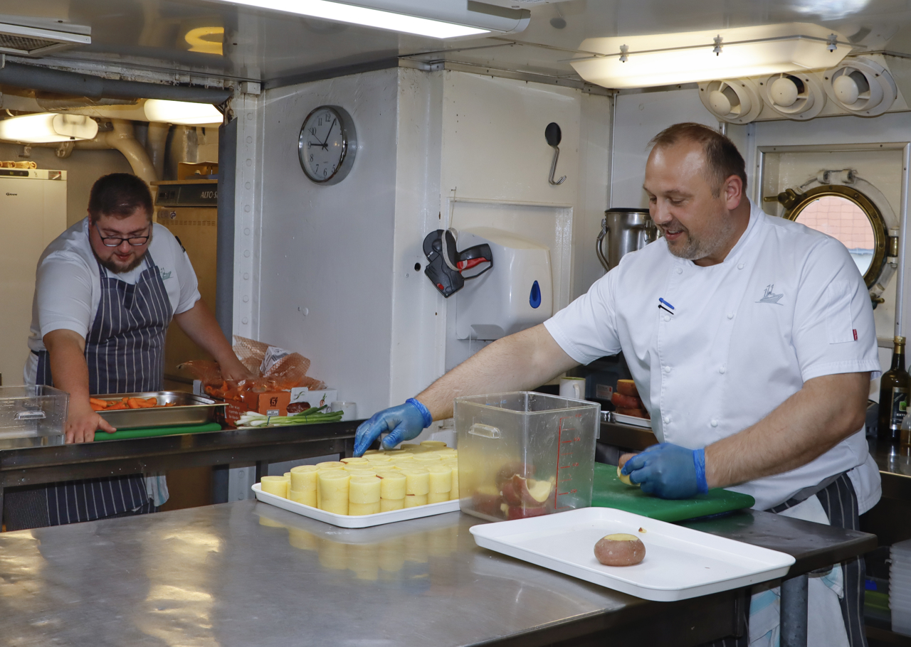 Jacek, Commis Chef, and Raf, Sous Chef, preparing vegetables for an exclusive evening event aboard Britannia.