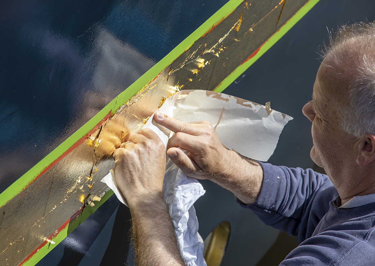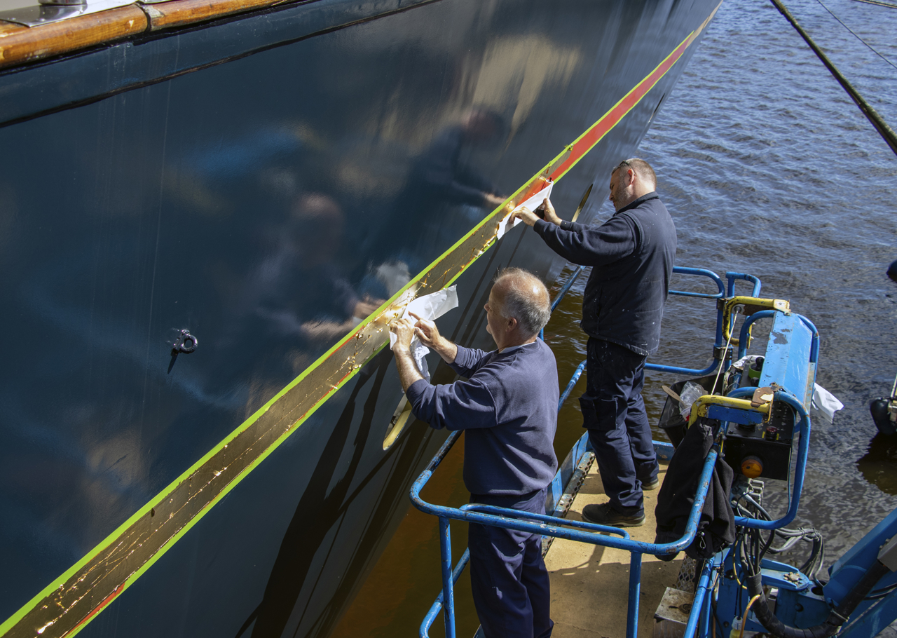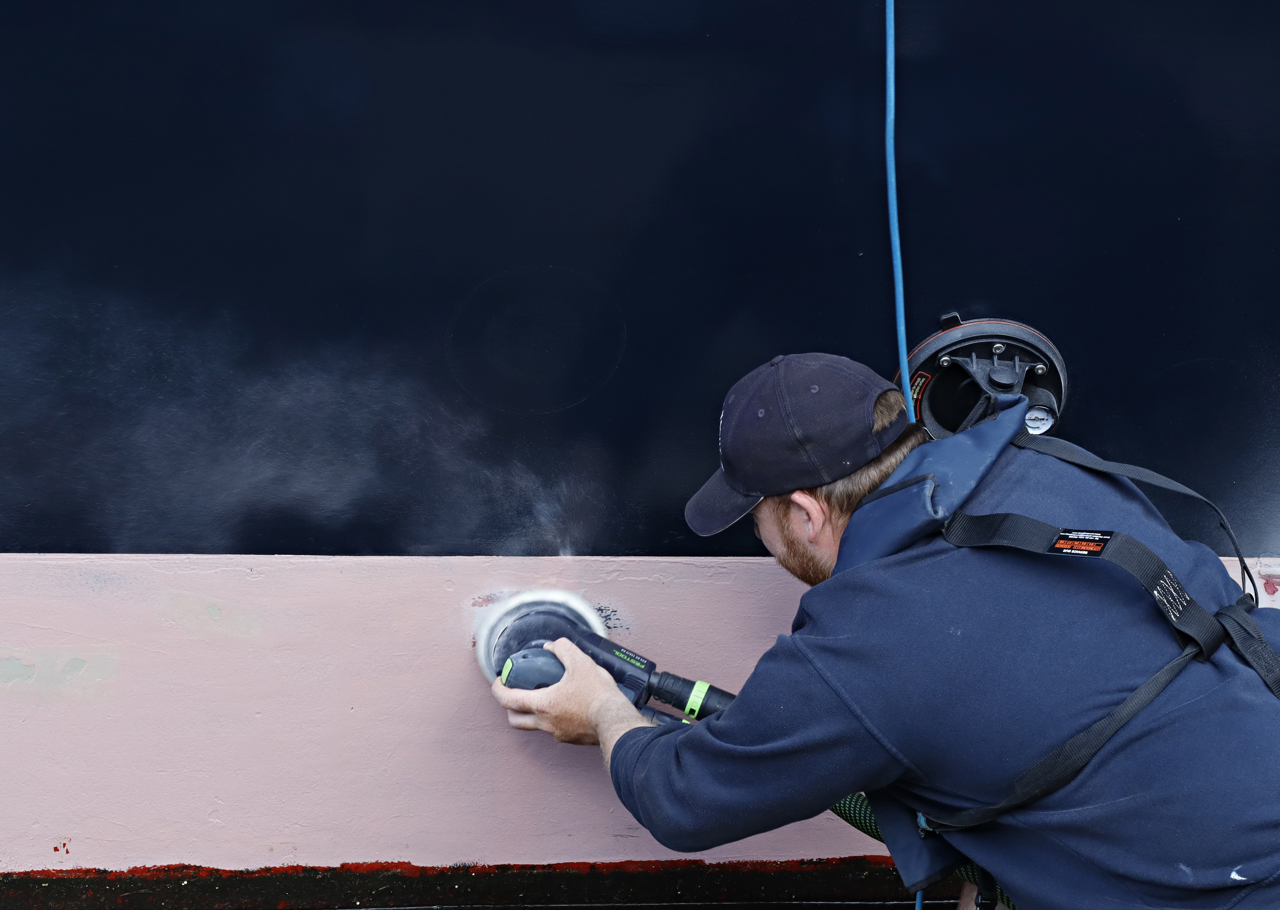 Stevie sanding the boot topping, the area between the water lines of the ship when fully loaded and unloaded.
