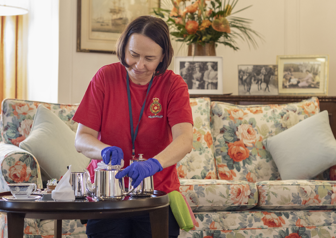 Housekeeper, Renata, polishing the tea set in the State Drawing Room, where the Royal Family would spend time relaxing.