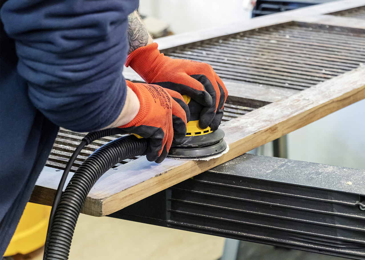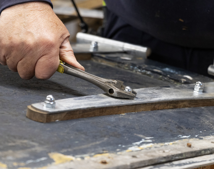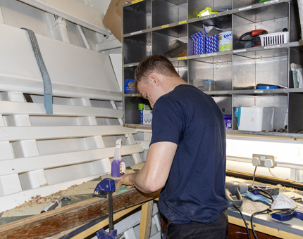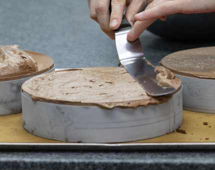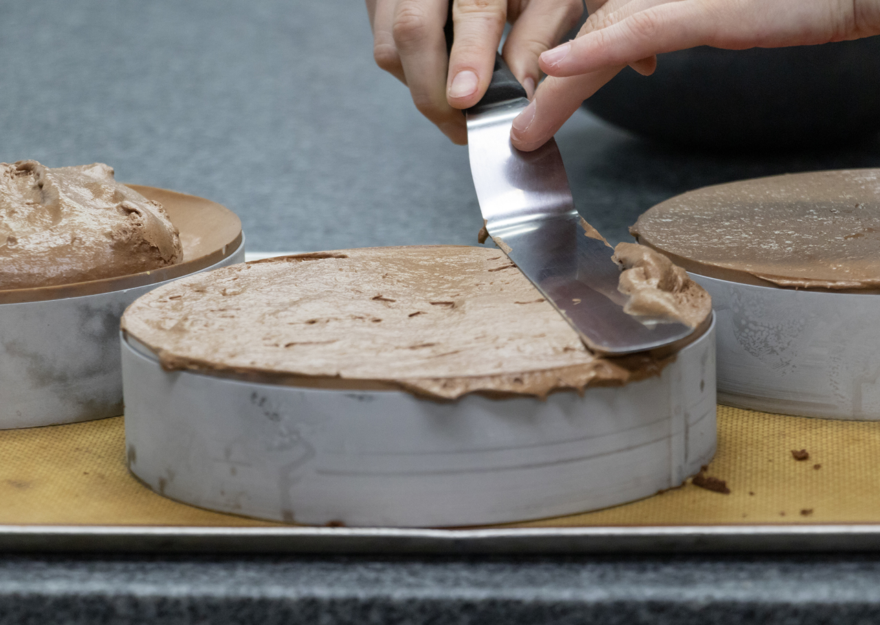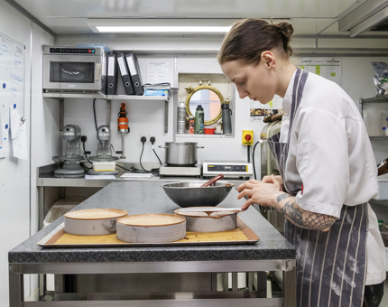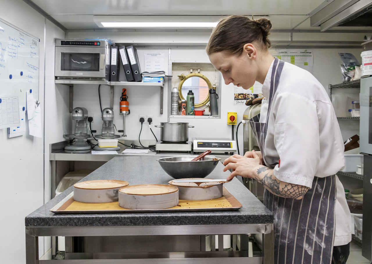 Chef de Partie, Amelia, adding the final touch of icing to delicious chocolate fudge cakes for the Royal Deck Tearoom.