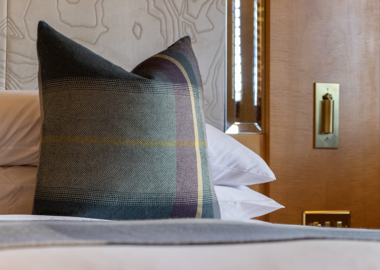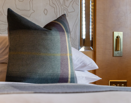 The beautiful cushions and throw by Araminta Campbell tell Fingal's story. The purple heather of the Scottish mountain landscape, a bright light casting the warm glow of the lighthouse beam, guarding ships safely away from the rocky shores.